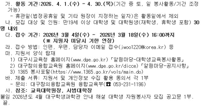 (붙임) 2026년도 4월 대구학생과학관 안내 해설 대학생 자원봉사자 모집 공고문 (1).hwp